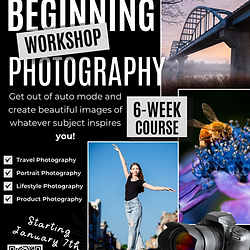 Are you interested in photography but are struggling to use your camera as well as you would like? Are you tired of spending hours on YouTube looking for answers to questions? Just love taking beautiful images and want to do more with your camera? This 6-week 6-class, in-person photography workshop will get you out of auto mode and create beautiful images of whatever subject inspires you! This course is for anyone wanting to know more about photography and understand how their camera works. We will cover the exposure triangle, composition, editing, equipment choices, and more. Each class will focus on specific aspects of photography and using your equipment to create amazing images. After covering the new information, we will have the opportunity to try out our new skills with hands-on activities to provide a chance to get feedback and questions answered right away. Then each week we will have homework to continue working on our new skills, and a private online group to post images and ask questions of the instructor and peers throughout the week. Session 1: Getting Started in Manual Mode Session 2: Understanding Aperture and Depth of Field Session 3: The How and Why of Shutter Speed Session 4: Composing better images and telling a story Session 5: Exploring Photography Styles Session 6: Post-Processing and Editing Starting: January 7th (No Class Feb. 4th) Equipment needed for this workshop: Any DSLR or Mirrorless camera with a Manual Mode option(if you are unsure, please email contact@firstcitycreatives.com with questions) Optional equipment: Additional lenses, tripod, computer for editing, editing software(These items are not required for the workshop, but are nice to have)